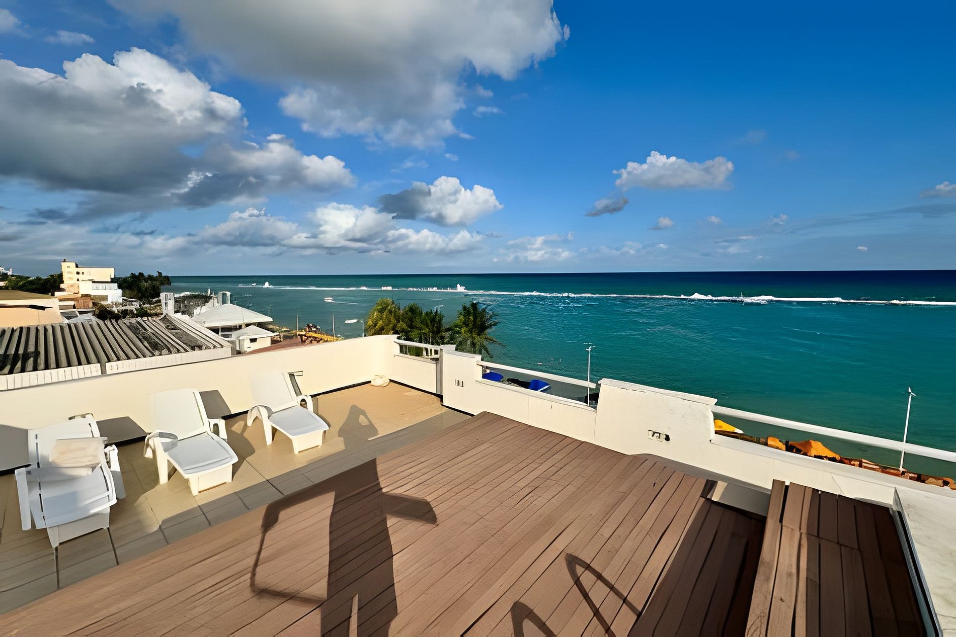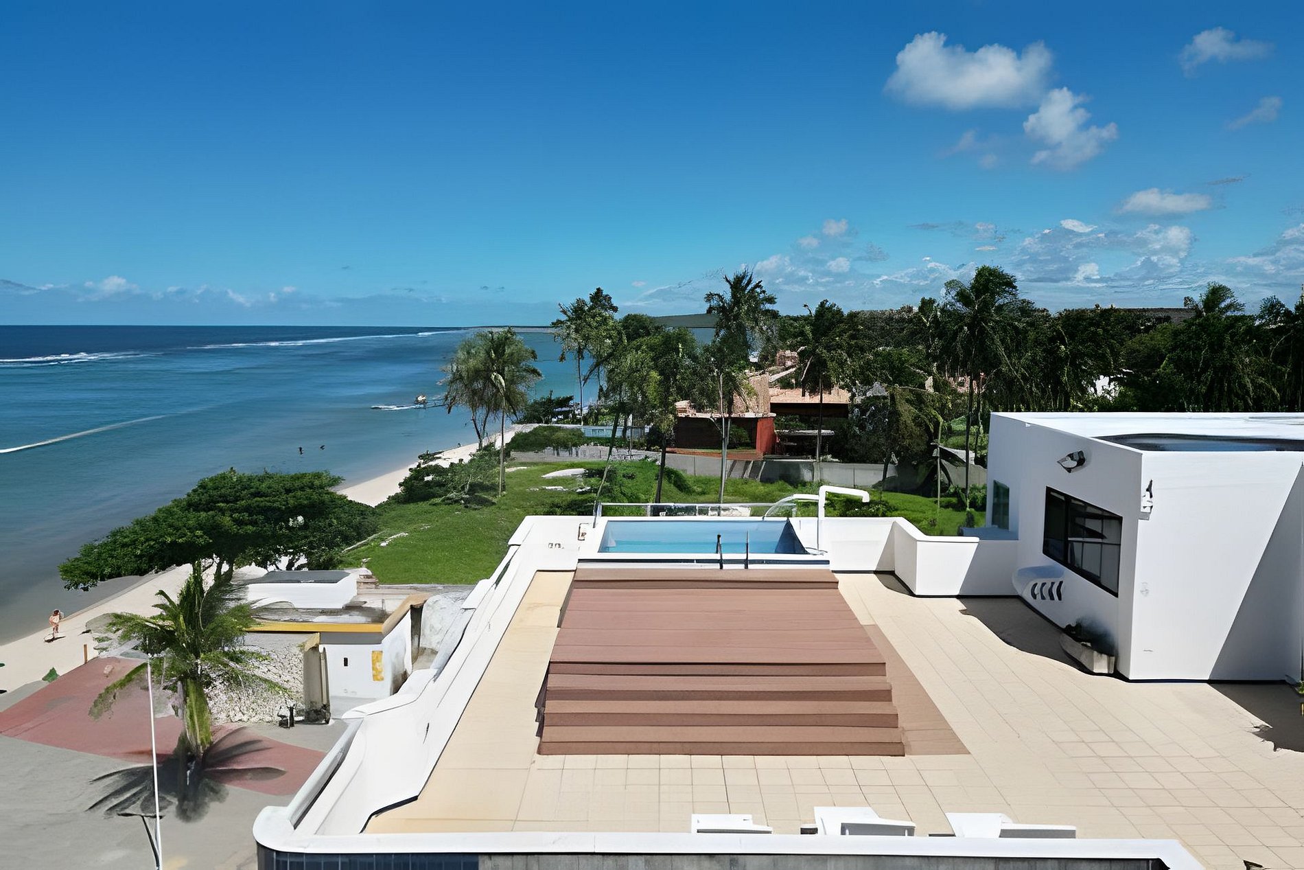 A cobertura é duplex e possui na parte de baixo: sacada frente mar, sacada lateral, quarto 1, suíte 1, suíte 2, wc social, cozinha, sala de estar e sala de jantar. Na parte de cima: suíte 3, quarto 2, banheiro social, churrasqueira, piscina, vista mar, sala de apoio.