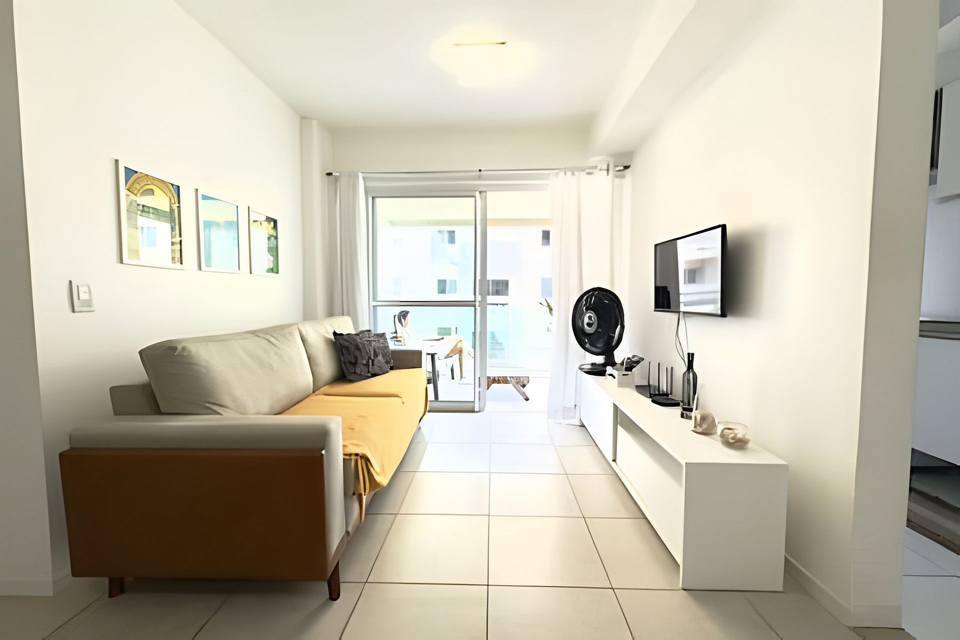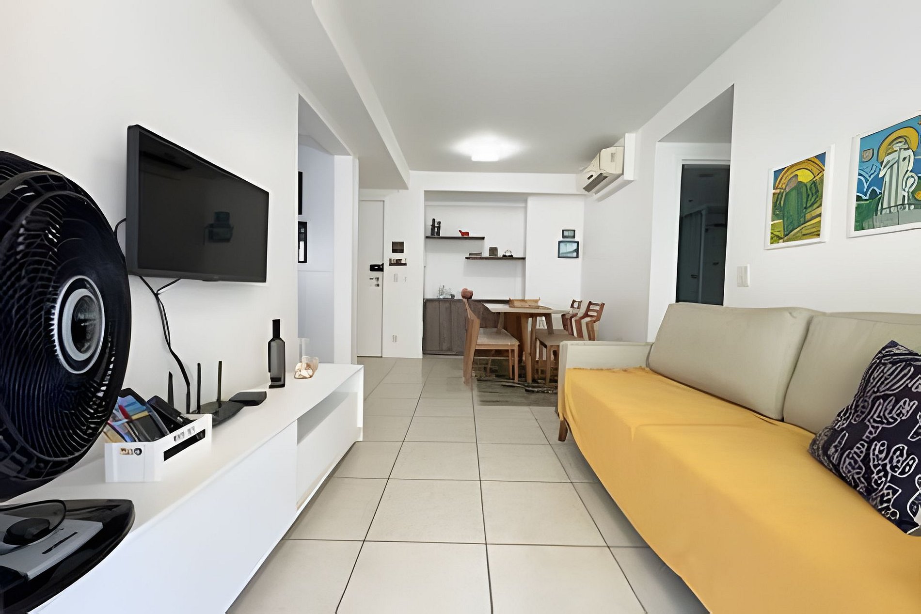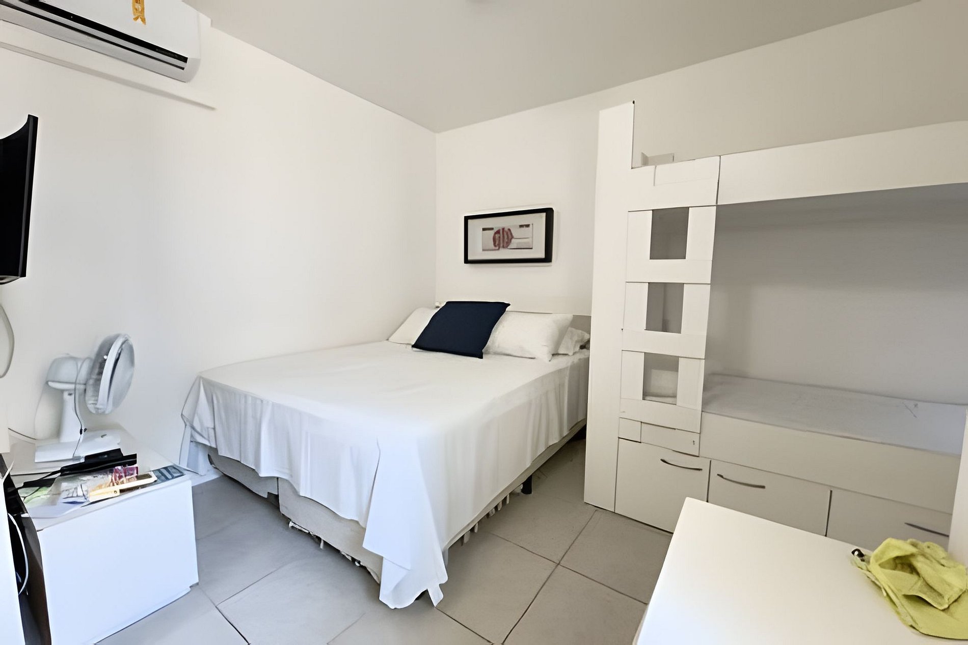 O apartamento é muito bom, localizado no oitavo andar, bem ventilado e espaçoso. Possui uma varanda com vista para o mar, quarto com uma cama de casal e um beliche, cozinha completa, máquina de lavar, tv no quarto e na sala. Além disso tem todos utensílios necessários que você precisará na sua estadia.